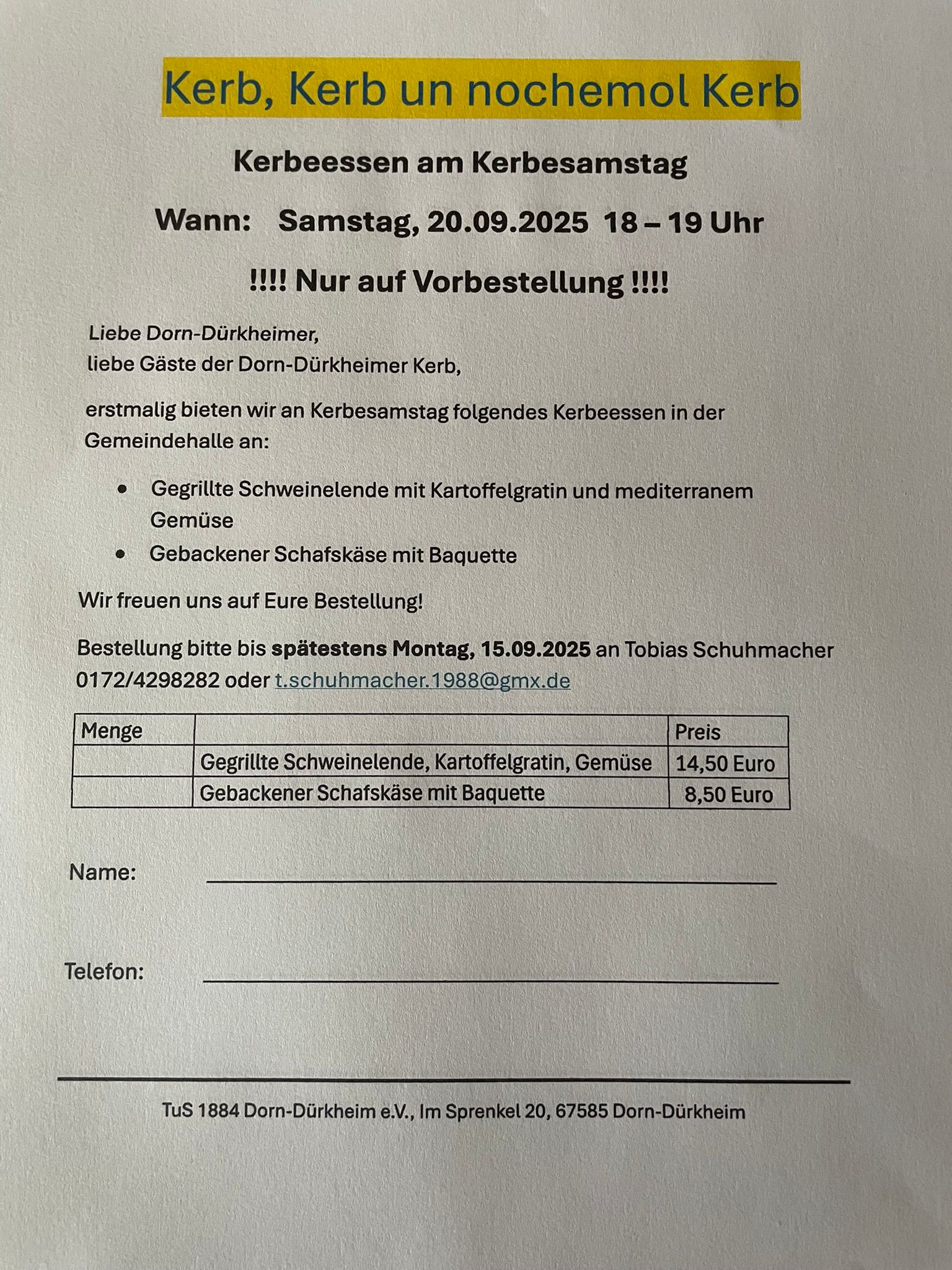 Es besteht die Möglichkeit für Kerbesamstag Essen vorzubestellen. Entweder telefonisch oder über beigefügten Link